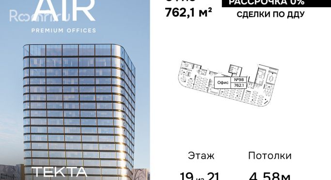 Наличие грузового лифта. Продается помещение свободного назначения 762.10 м² на 19 этаже бизнес-центра AIR.