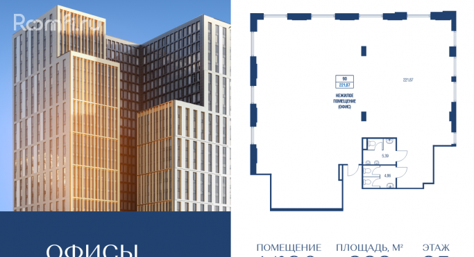 Продается коммерческое помещение общей площадью 222 м2 на 25 этаже в строящемся бизнес-центре АФИ2В Тагильская. 26-этажный бизнес-центр АФИ2В Тагильская от девелопера с мировым именем AFI Development — это инновационный комплекс, задающий новый стандарт деловых пространств на востоке Москвы. Проект объединяет статусные офисы, ресторанный дворик, супермаркет и озеленённую террасу, создавая полноценную экосистему для бизнеса. На первых этажах расположатся торговая галерея, ресторанный дворик и просторное лобби. Подземный паркинг на 200 машино-мест создаст удобную логистику для резидентов и гостей комплекса. Эргономичные openspace-планировки дадут возможность организовать на каждом этаже функциональные рабочие зоны, переговорные комнаты, кабинеты руководителей, конференц-зал, бизнес-гостиные и зоны отдыха. За счет неглубокой посадки офисов и панорамного остекления все помещения хорошо освещаются естественным образом. Современные инженерные системы (приточно-вытяжная вентиляция, мультизональное кондиционирование) и централизованная система управления зданием (BMS) гарантируют комфортный микроклимат и энергоэффективность. Круглосуточная охрана, видеонаблюдение и консьерж-сервис обеспечивают безопасность и высокий уровень сервиса. Стратегическое расположение на Открытом шоссе обеспечивает отличную логистику: всего 6 минут пешком до станции МЦК «Бульвар Рокоссовского» и 9 минут пешком до одноименной станции метро. 15 минут до МКАД и ТТК. Рядом расположены ЖК «Сиреневый парк», «парк Лосиный Остров» и вся необходимая социальная инфраструктура. Ввод в эксплуатацию запланирован на III квартал 2026 года. Действует рассрочка 0% до конца строительства.