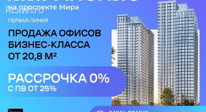 Рассрочка 0% от Застройщика, ПВ от 30% Продаются офисные и коммерческие помещения различных площадей - от 20 до 81 м в МФК бизнес-класса «Мираполис», на первой линии проспекта Мира. Продажа от Застройщика. Ввод в эксплуатацию - IV квартал 2026 г. Рядом находится ТПУ Ростокино, который объединяет МЦК и МЦД. Пассажиропоток через станцию МЦК «Ростокино» составляет 64 тыс. человек (по данным Метростат) . Дополнительным источником арендаторов и клиентов выступают торговые центры, ВУЗы, туристические объекты в районах ВДНХ, Останкино, Ботанический сад. ХАРАКТЕРИСТИКИ: Высокий пешеходный трафик Витражное остекление Удобные планировки с максимальным полезным пространством Несколько отдельных входов с уровня земли Выделенная мощность 0,3 кВт Высота потолков до 3 м Мокрые точки Первая линия проспекта Мира Подземный паркинг Коворкинг-пространство на территории Система видеонаблюдения и круглосуточная охрана УСЛОВИЯ: Продажа по ДДУ Покупка доступна в рассрочку Покупка возможна в лизинг на выгодных условиях ИНФРАСТРУКТУРА: торговая галерея минимаркет ресторан и кафе отделения банка салон красоты и бытовые сервисы коворкинг и общественные пространства. АРХИТЕКТУРА: Архитектурная концепция от бюро Камень. Проекты бюро неоднократно получали престижные международные награды. Специально для «Мираполис» команда бюро разработала концепцию фасадов, общественных зон и благоустройства. Руководитель архитектурного бюро Камень - Иван Греков - отмечает, что ключевыми принципами проекта стали максимальная функциональность, гармоничная интеграция в городскую среду и создание динамичной архитектуры, отражающей современный прогрессивный образ жизни. «Проект можно рассматривать как вертикальный город: по мере роста зданий в высоту мы переходим в приватные жилые зоны с впечатляющими видами на парк и город», - уточняет автор. ОПИСАНИЕ ЛОКАЦИИ: «Мираполис» состоит из четырёх башен высотой 33-35 этажей. Высокая проходимость обеспечивается пассажиропотоком ТПУ Ростокино. В комплексе будет проживать свыше 5000 резидентов, а население в радиусе 1 км превышает 14 000 человек, что делает объект привлекательным для коммерческих инвестиций. ТРАНСПОРТНАЯ ДОСТУПНОСТЬ: «Мираполис» расположен на проспекте Мира - одной из ключевых магистралей города. 8,2 км до ТТК 11,5 км до Садового кольца Рядом проходит МСД 5 минут на машине до м. ВДНХ 400 м до МЦК Ростокино Благодаря удобным развязкам и близости ко множеству видов транспорта, дорога до центра Москвы занимает около 30 минут. Рядом проходит наземный общественный транспорт, связывающий район с Медведково, Останкино и станциями метро «ВДНХ», «Красносельская», «Сокольники», «Преображенская площадь».[#8103101#]